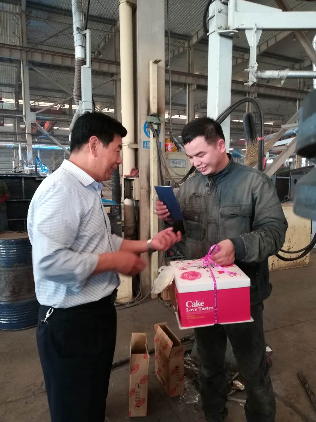 5月10日上午8時(shí)許,公司工會(huì)主席路建存攜帶生日蛋糕和生日賀卡走進(jìn)車(chē)間,親自將生日禮物送到當(dāng)天過(guò)生日的員工手中,并代表公司董事長(zhǎng)、總經(jīng)理表示生日祝賀。當(dāng)路主席把生日蛋糕送到員工手中時(shí),他們感到非常驚訝,有的員工本人都不記得今天是自己生日,而公司把生日禮物送到了手中,員工們激動(dòng)的說(shuō):非常感謝公司領(lǐng)導(dǎo)的關(guān)懷。