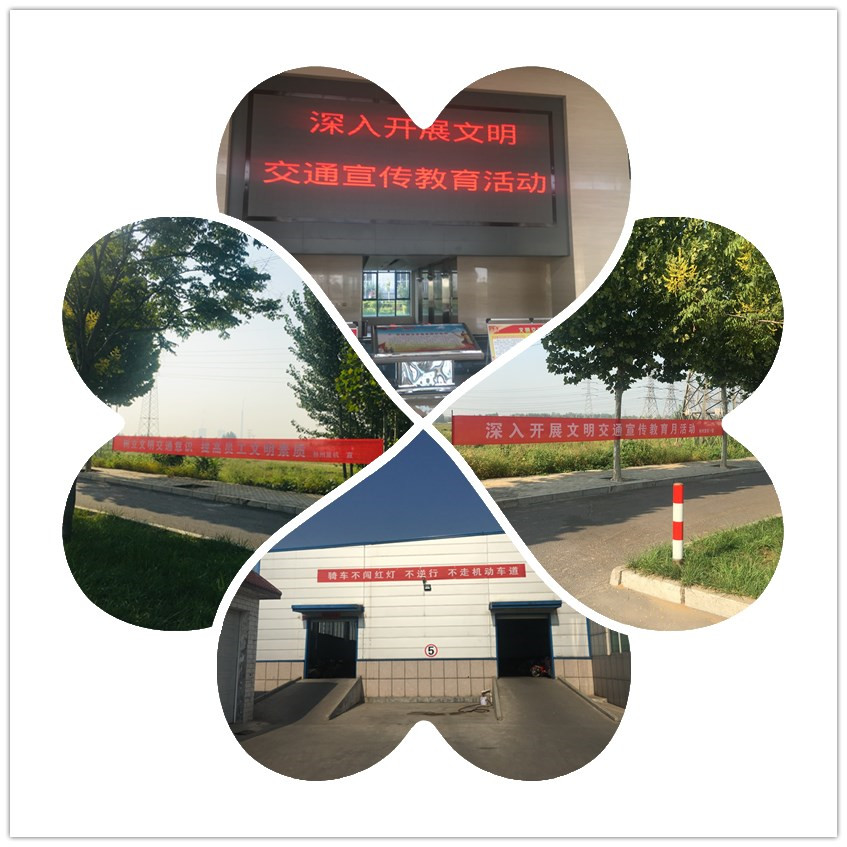 懸掛文明交通宣傳標(biāo)語(yǔ),營(yíng)造濃厚的宣傳氛圍。公司在廠區(qū)門口對(duì)面及存車棚外等懸掛文明交通宣傳教育標(biāo)語(yǔ),使員工在上下班路上抬頭就可以看到醒目的標(biāo)語(yǔ),特別是在存車棚處時(shí)刻提醒員工“騎車不闖紅燈、不逆行、不走機(jī)動(dòng)車道”。通過(guò)懸掛標(biāo)語(yǔ),營(yíng)造了濃厚的文明交通宣傳教育氛圍。
