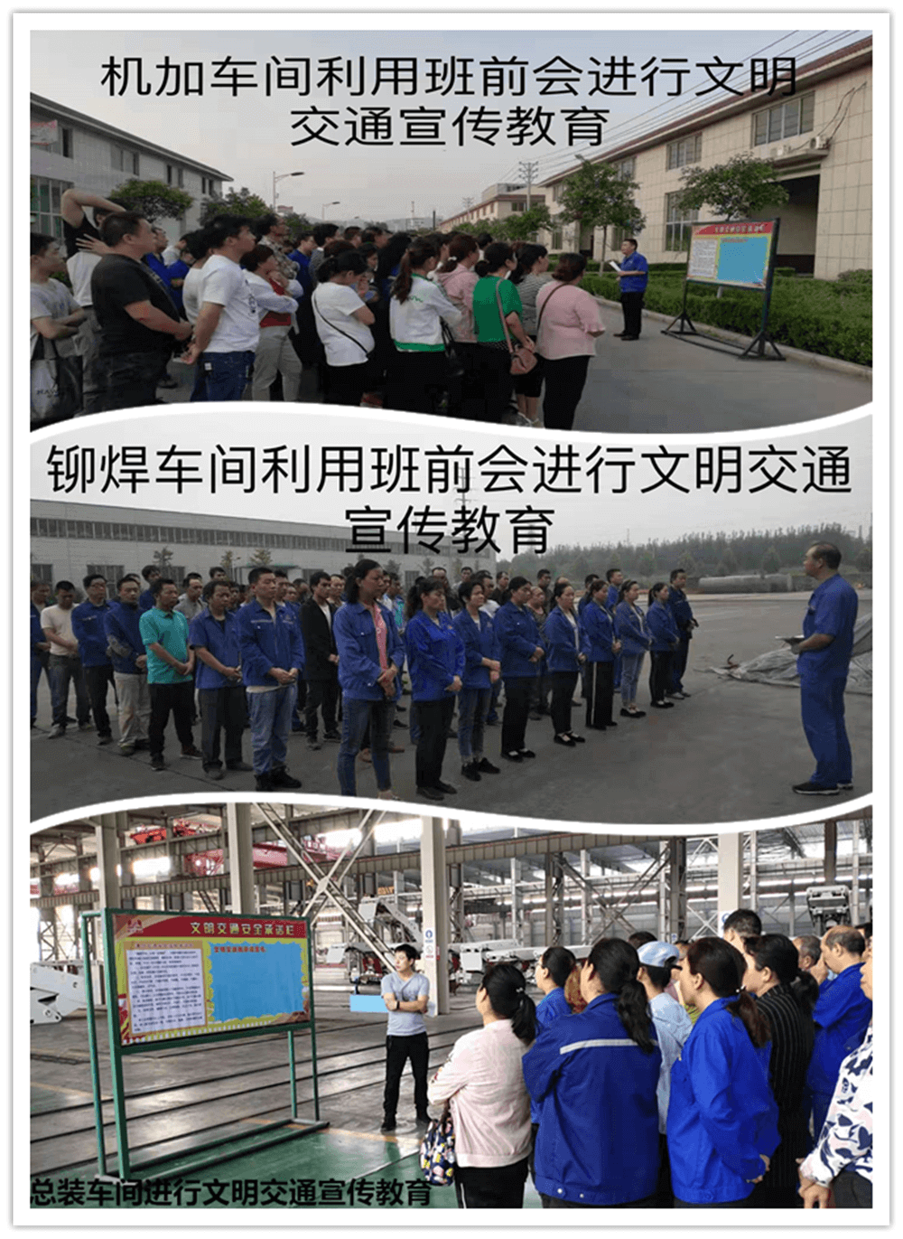 在全體員工中廣泛開(kāi)展學(xué)習(xí)“文明交通宣傳教育月活動(dòng)方案”。各單位利用各種會(huì)議、板報(bào)及微信群等形式,對(duì)員工貫徹學(xué)習(xí)《林州重機(jī)集團(tuán)關(guān)于開(kāi)展文明交通宣傳教育月活動(dòng)方案》文件精神,使每位員工對(duì)活動(dòng)要求做到人人皆知,特別是“六大文明交通行為”、“六大交通陋習(xí)”、“六大危險(xiǎn)駕駛行為”,每位員工都應(yīng)知悉知。