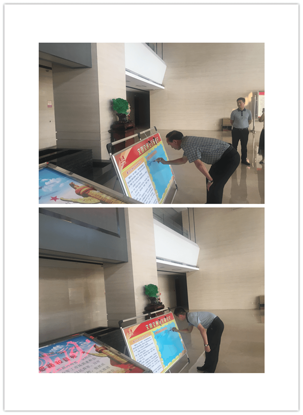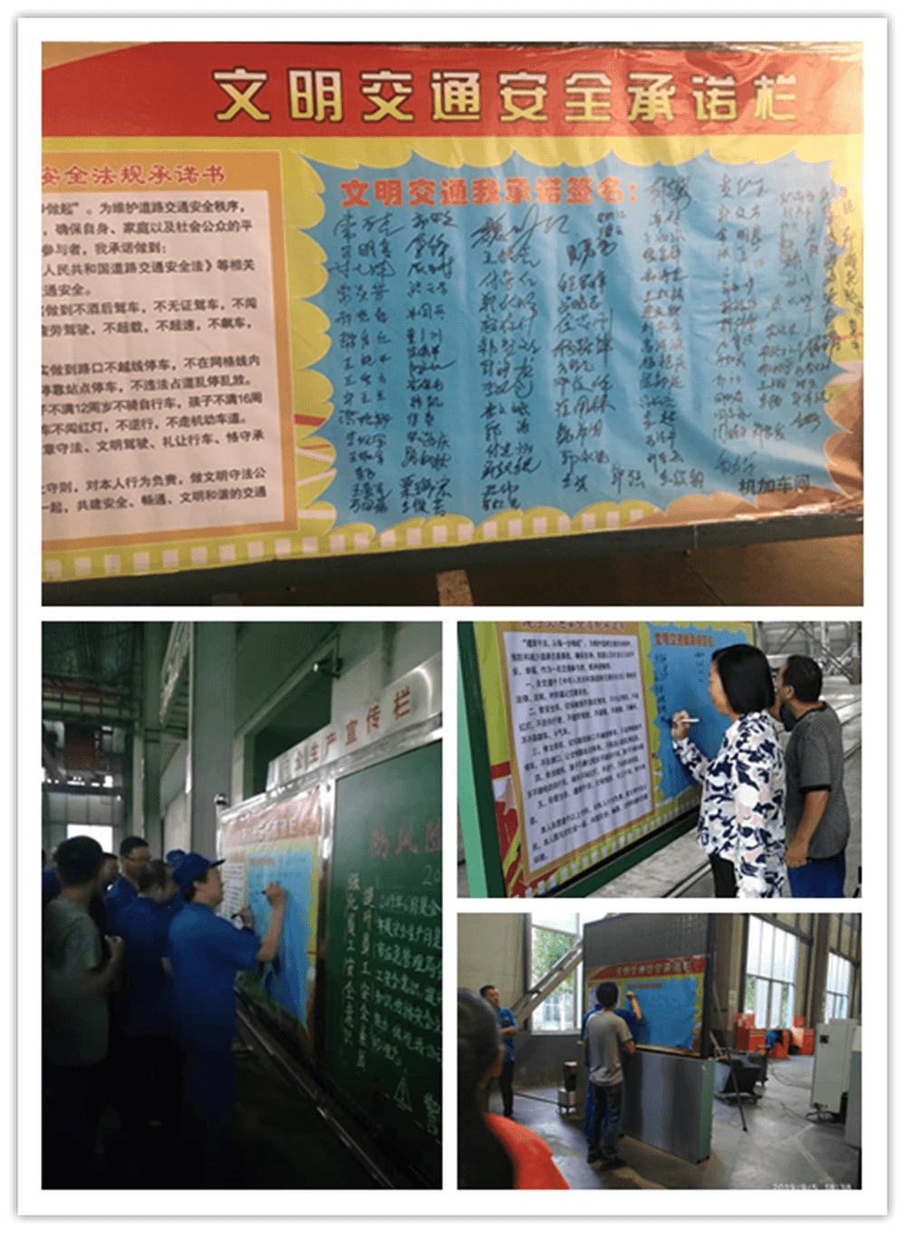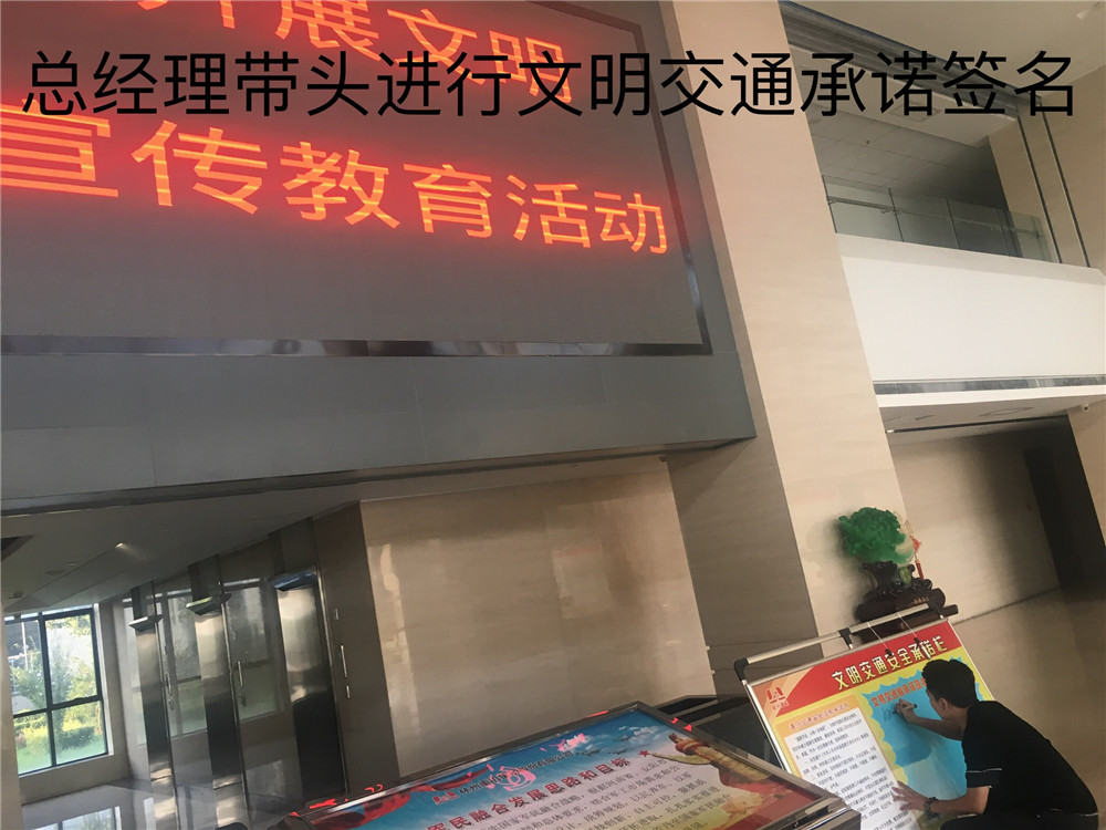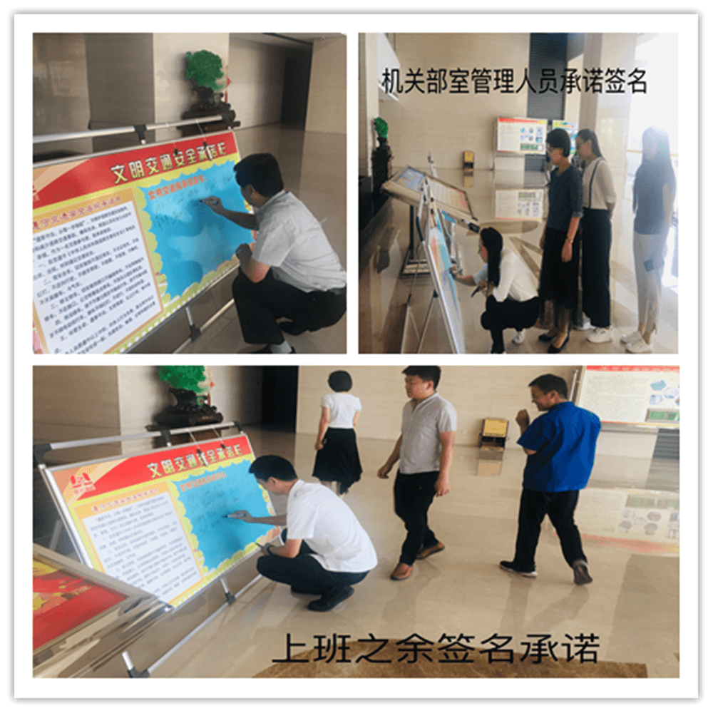 簽訂“遵守交通安全法規(guī)承諾書(shū)”。公司制作了“遵守交通安全法規(guī)承諾欄”版面十余塊,擺放在醒目位置,以部門為單位,每位員工在版面上進(jìn)行簽名承諾。公司總經(jīng)理郭釧帶頭在《文明交通承諾欄》上簽名,其他領(lǐng)導(dǎo)和部門員工也陸續(xù)進(jìn)行了簽名,通過(guò)交通安全承諾簽名,使每位員工時(shí)刻提醒自己,履行自己承諾。