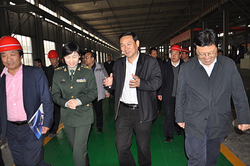 參觀期間,劉洋一行認真了解了企業(yè)的發(fā)展情況,每到一處設備前,郭現(xiàn)生董事長都會熱情地介紹設備名稱、作用等,劉洋不時點頭稱贊,參觀完重機車間,劉洋一行在車間門口與市領導及公司負責人合影留念。